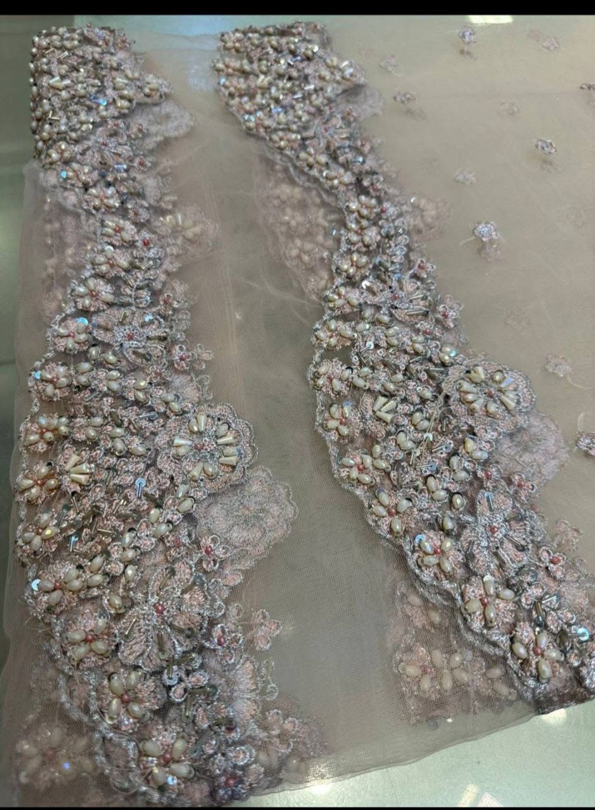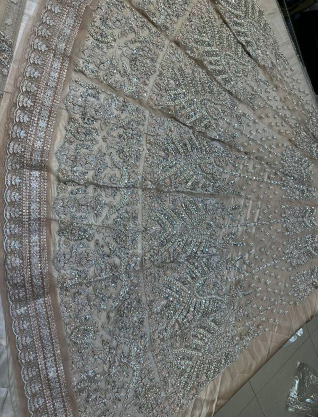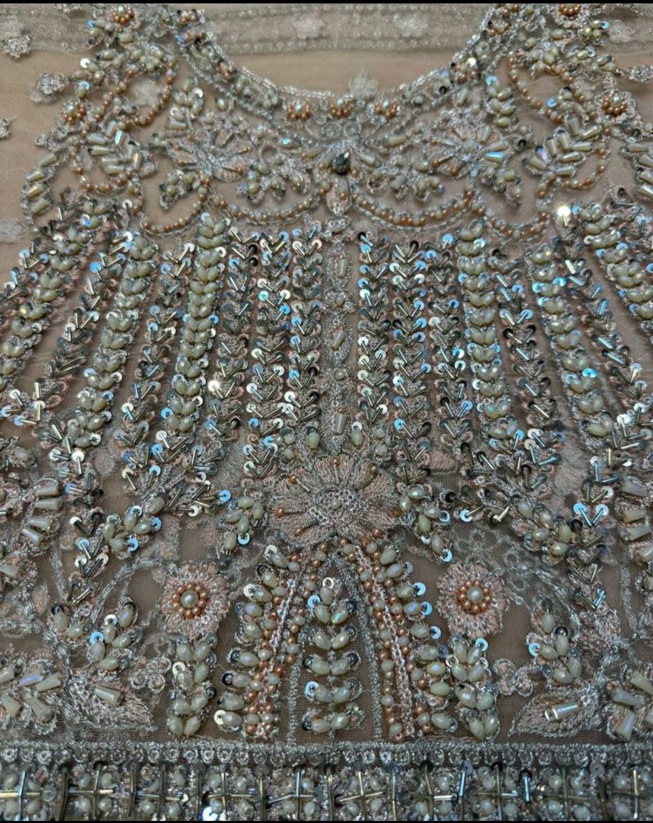 Fabric: Premium net fabric layered with hand-embroidered motifs and shimmering details