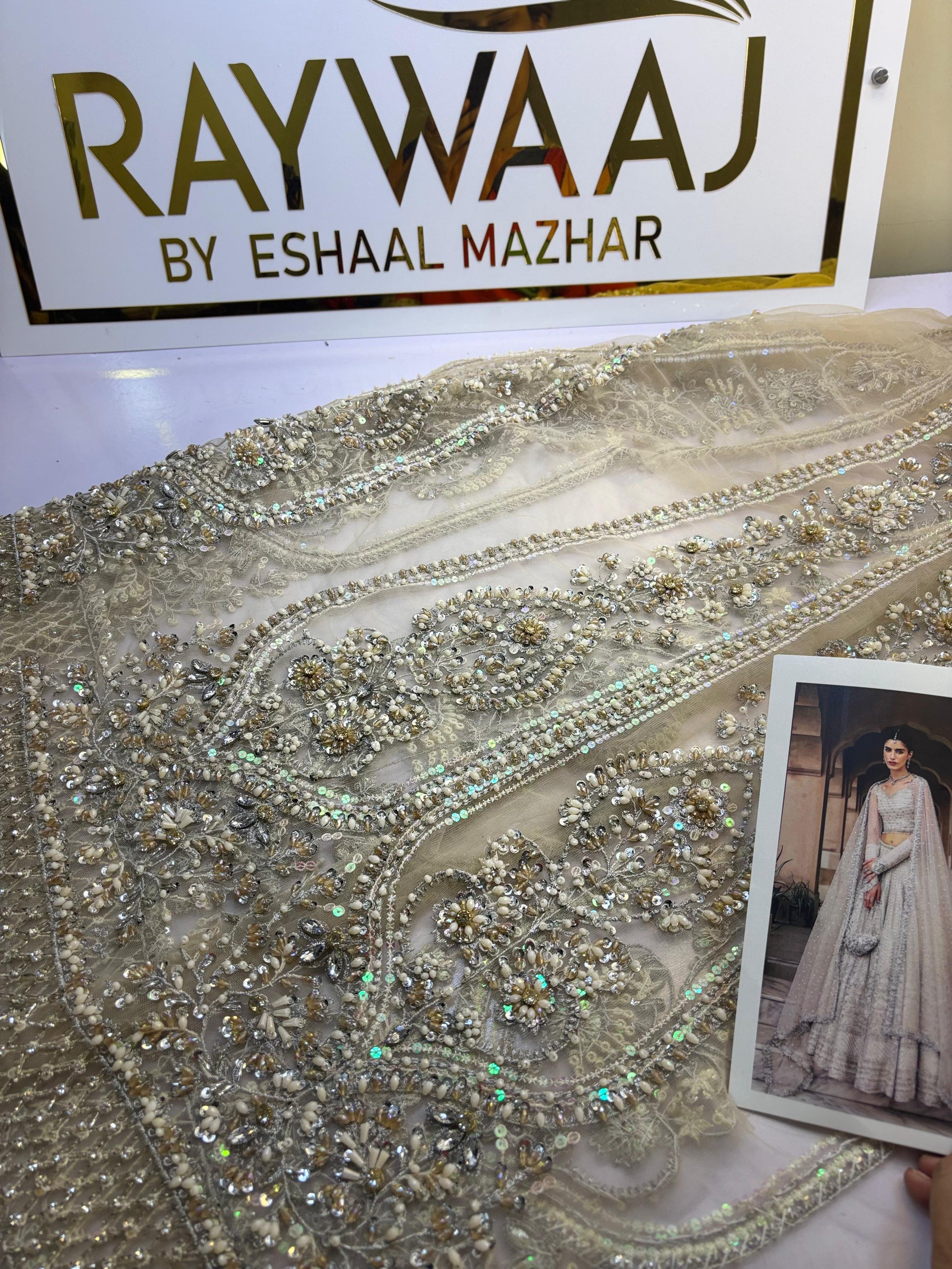 This ethereal ensemble, crafted in shimmering silver hues, is adorned with intricate embellishments and delicate beadwork, making it the perfect choice for weddings, receptions, and grand celebrations. The luxurious fabric and flawless design create a sophisticated aura, ensuring you captivate attention wherever you go. The matching dupatta and lehenga complete the look, adding a touch of glamour and elegance to your special occasion.