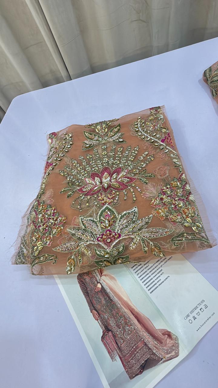 This regal outfit rendered in a beautiful shade of Pink on an organza canvas for shirt and Raw-silk palazzo, with heavy embellished motifs along with intricate details. The timeless look is completed with an organza dupatta along with four side border