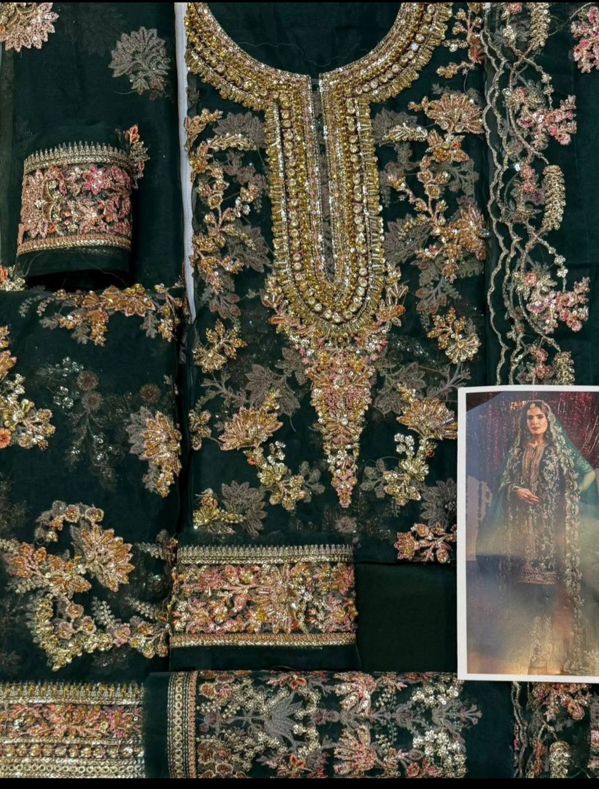 Step into a world of elegance with the Royal Emerald Bridal Ensemble. This luxurious bridal outfit features intricate hand embroidery on a deep emerald base, perfectly complemented with fine embellishments. The flowing dupatta is adorned with delicate detailing, adding an ethereal charm to this masterpiece. Ideal for weddings, engagements, and special occasions, this regal attire is a testament to timeless craftsmanship.