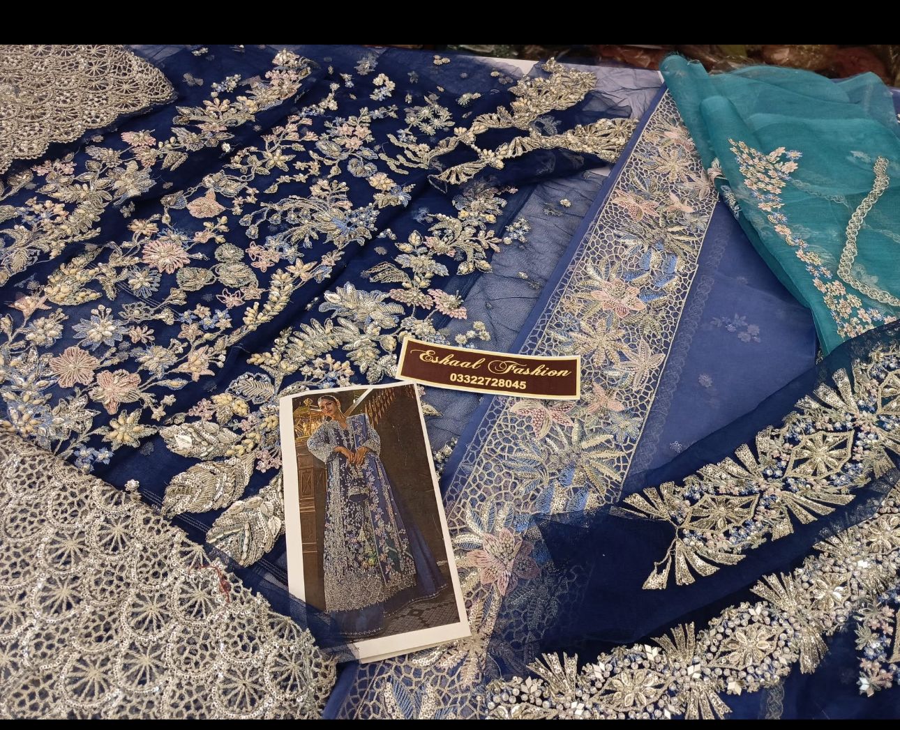 Make a bold and elegant statement with Elise by Prince Fancy Clothing Store. This deep blue ensemble, richly adorned with intricate silver and pastel floral embroidery, is a perfect blend of regal charm and contemporary design. Crafted with a structured long shirt, flowing trousers,